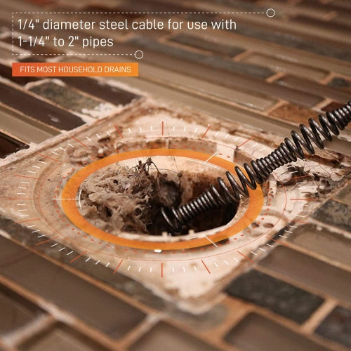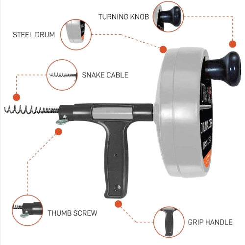 - 1/4" Dia. Steel Snake Cable with spiral head designed for 1-1/4" through 3" drain pipes. Durable steel drum for long lasting use. Grip handle and turning knob for rotating the drum to clear the clog. Steel Thumbscrew keeps the cable in place while not in use, and should also be tightened after you pull the cable out, in order to properly rotate the cable.