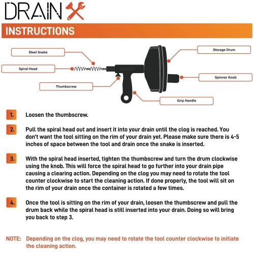 - Our 50 Foot Drain Auger is a great household tool for quickly unclogging any drain including kitchen and bathroom sinks, bathtubs, showers, and drainage pipes. Instead of calling a plumber and a getting a big bill, try unclogging the drain yourself! Bonus Work Gloves and Drawstring Carrying Pouch Included.