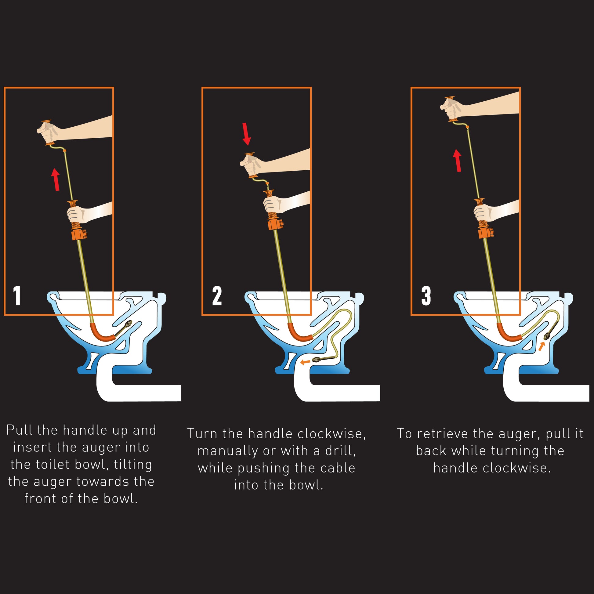 3ft Toilet Auger with curved end to avoid porcelain damage and contact with toilet residue. Ideal for minor tasks as well as stubborn and frequent clogs that does not warrant a visit from an expensive plumbing service provider.