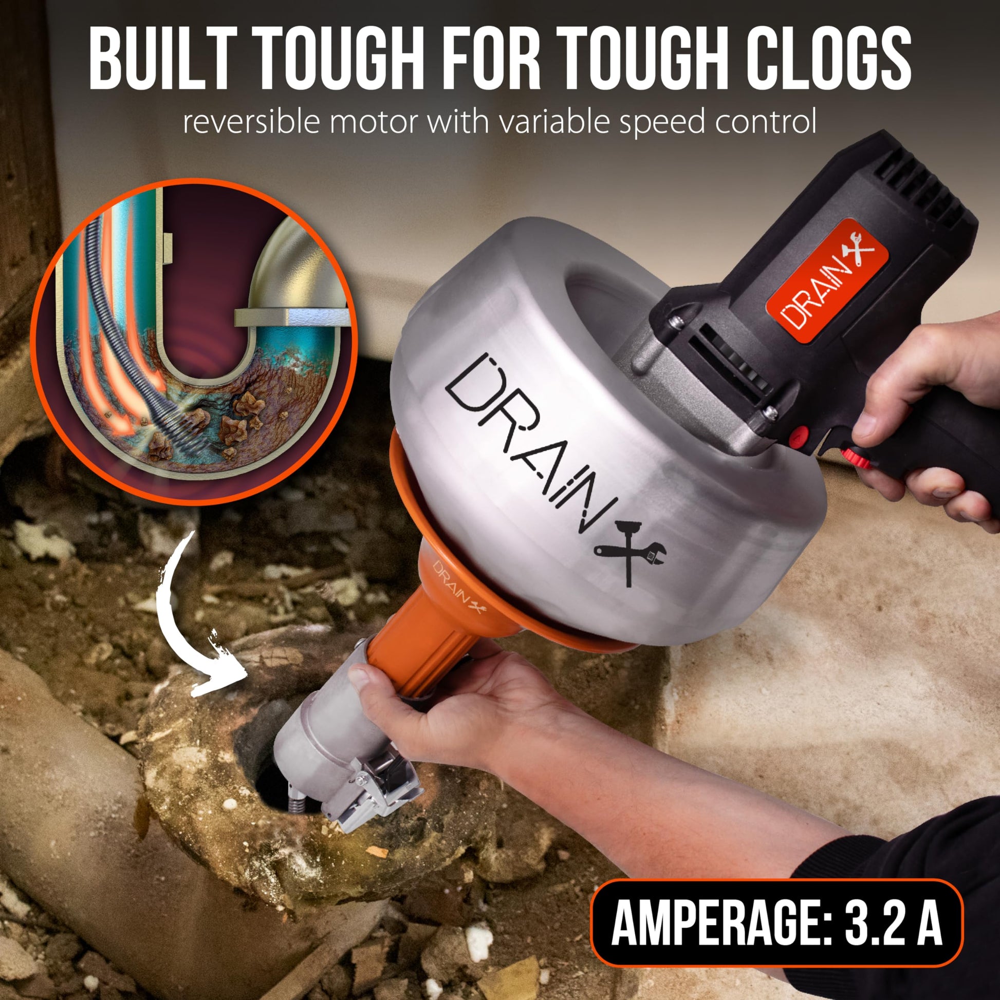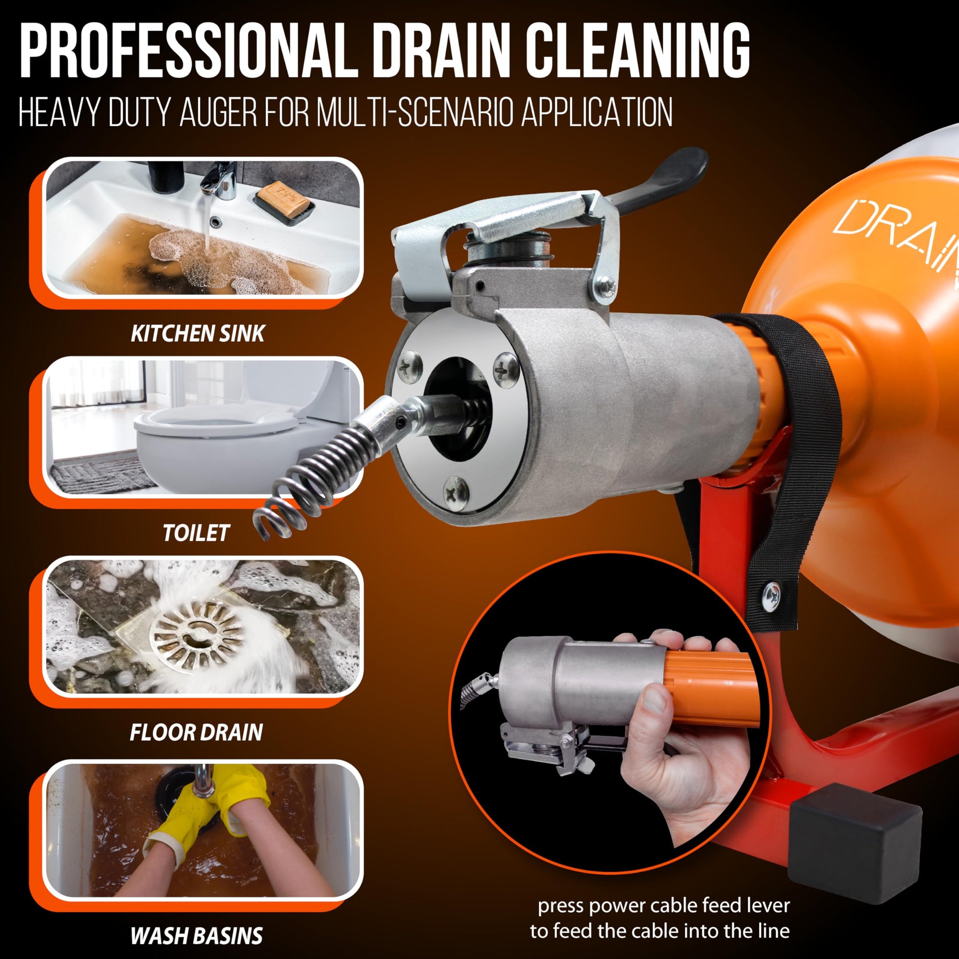 DrainX XS50 Electric Spinfeed Drum Auger, 1/4" Cable