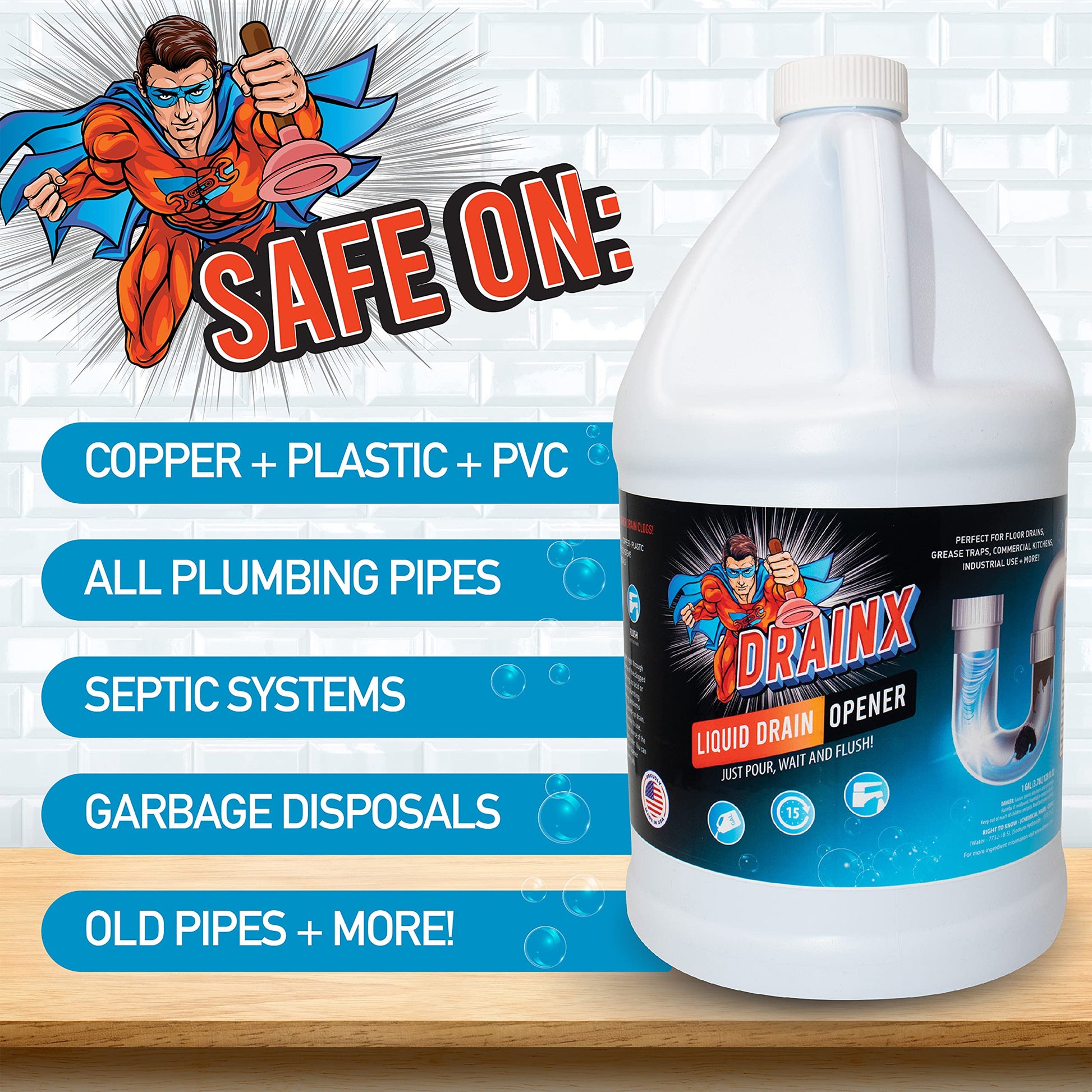 Highly concentrated solution goes right through the water and directly to the source of the clogged or slow-running drain. Non-fuming, no acid or bleach odors and safe to use on plumbing. Regular use prevents plumbing problems and water damage caused by backed-up drain. DrainX Liquid Drain Opener is easy to use, works fast and goes directly to the source of the problem - even in cold or standing water. You can also use Drainx Liquid Drain Opener in grease-traps and sump pits.