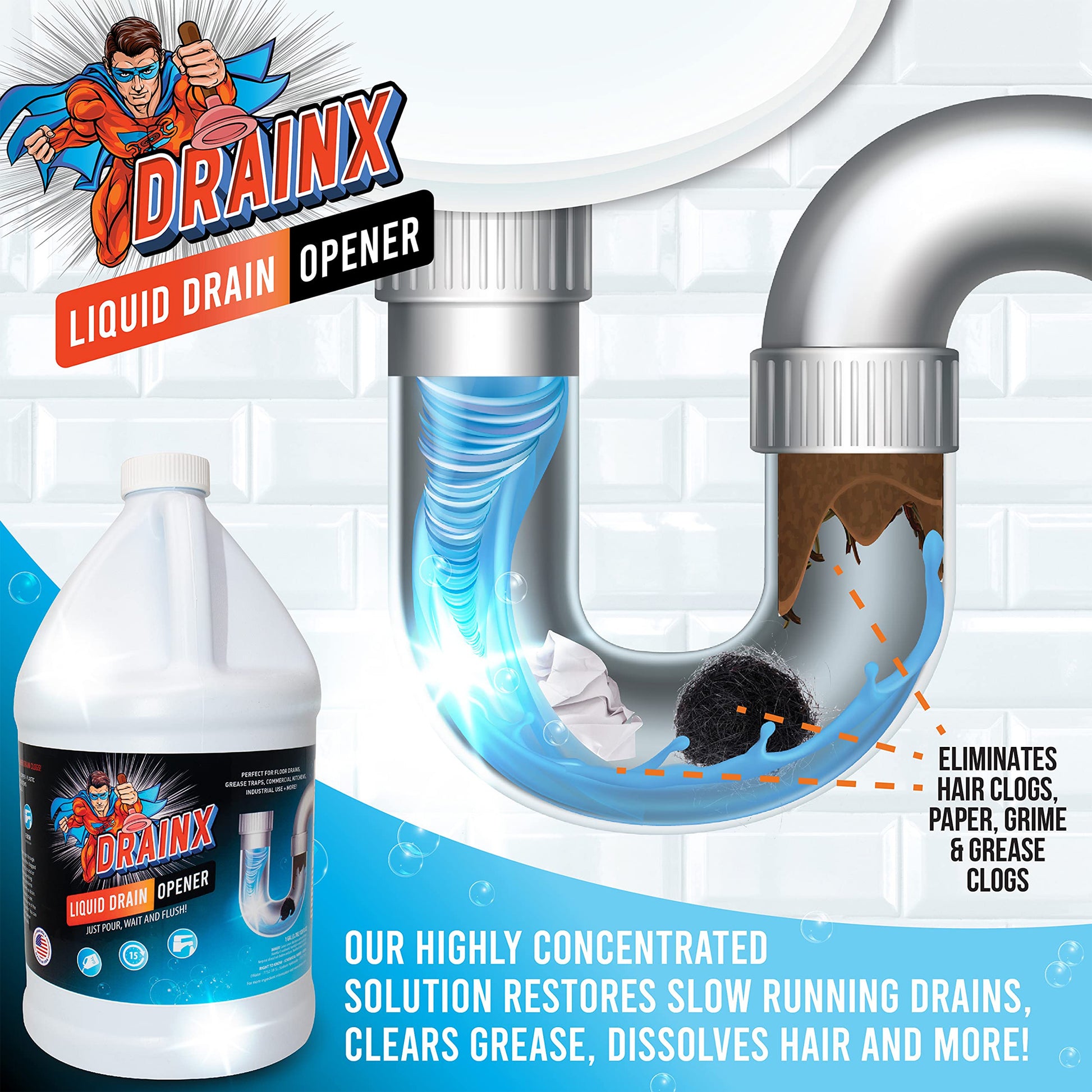 - DrainX Liquid Drain Opener Solution clears up hair, grease, soap, fats, food, waste and scum which causes drains and plumbing to run slowly. Use it in floor drains, grease traps, for commercial or any industrial application.