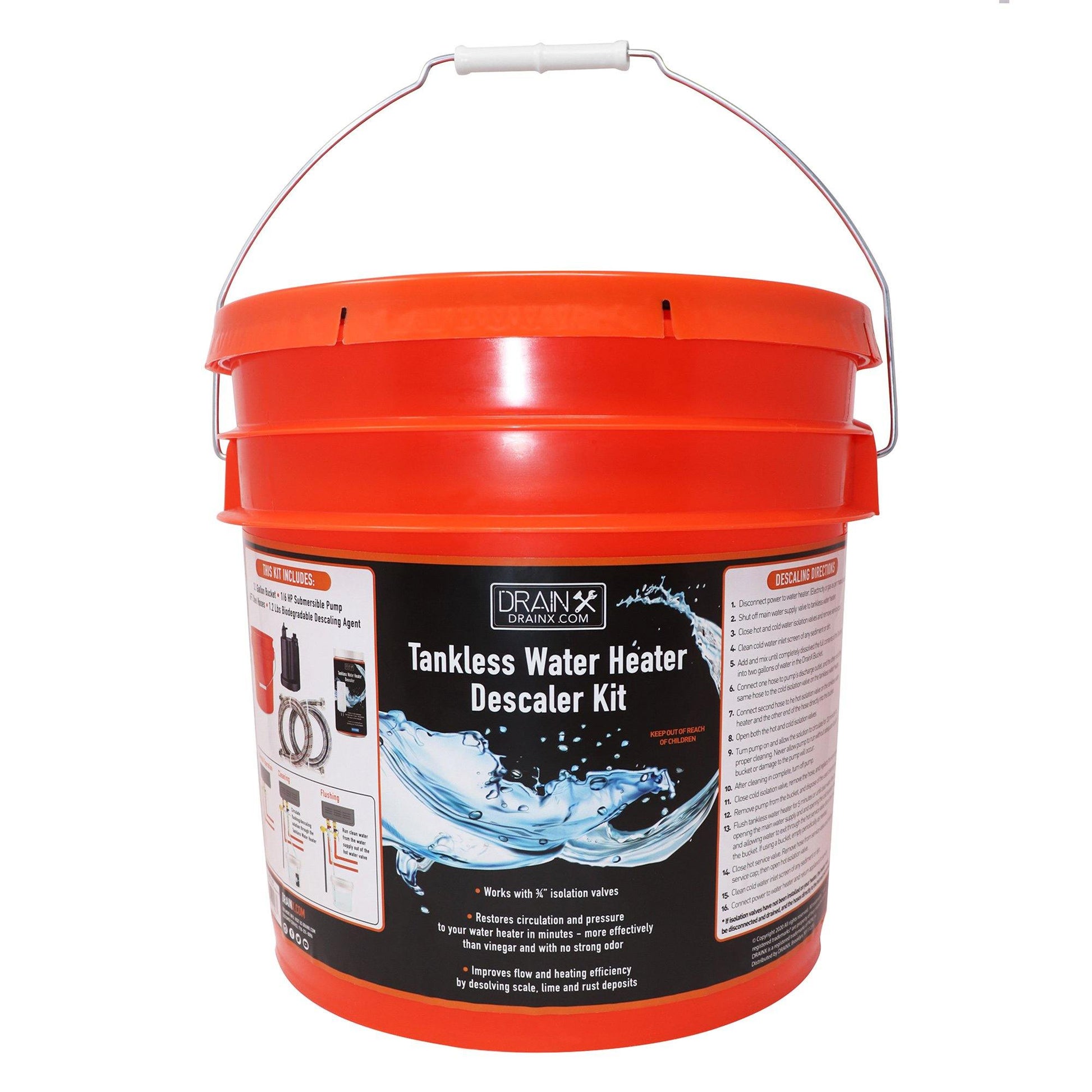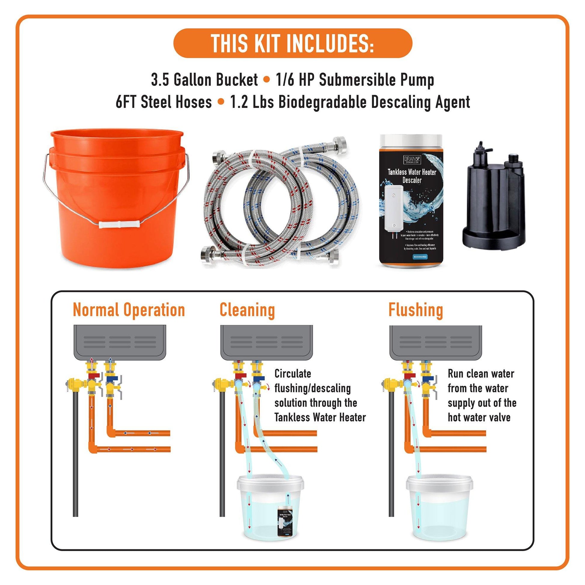 - Kit comes with 3.5 gallon bucket with lid, 1/6 HP Pump, 2 Steel hoses, and our descaler powder.