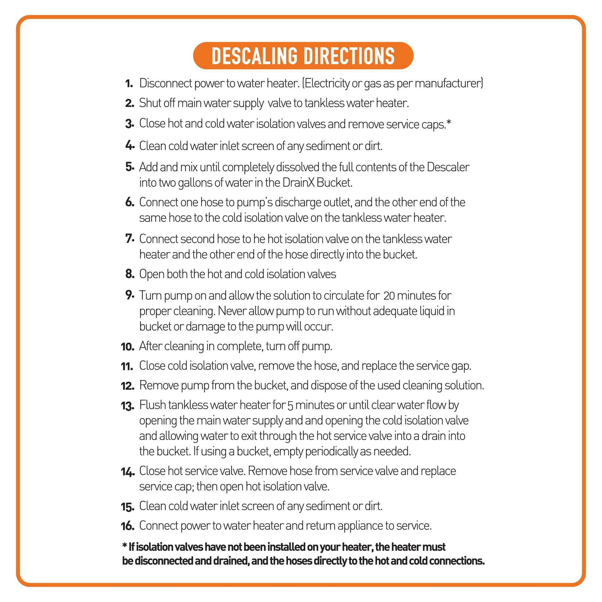 - 6 Foot hoses easily connect to tankless heater valves, and the kit will clean most heaters in 30 minutes or less! Usage instructions are included as an info-graphic on this listing as well as with your kit.